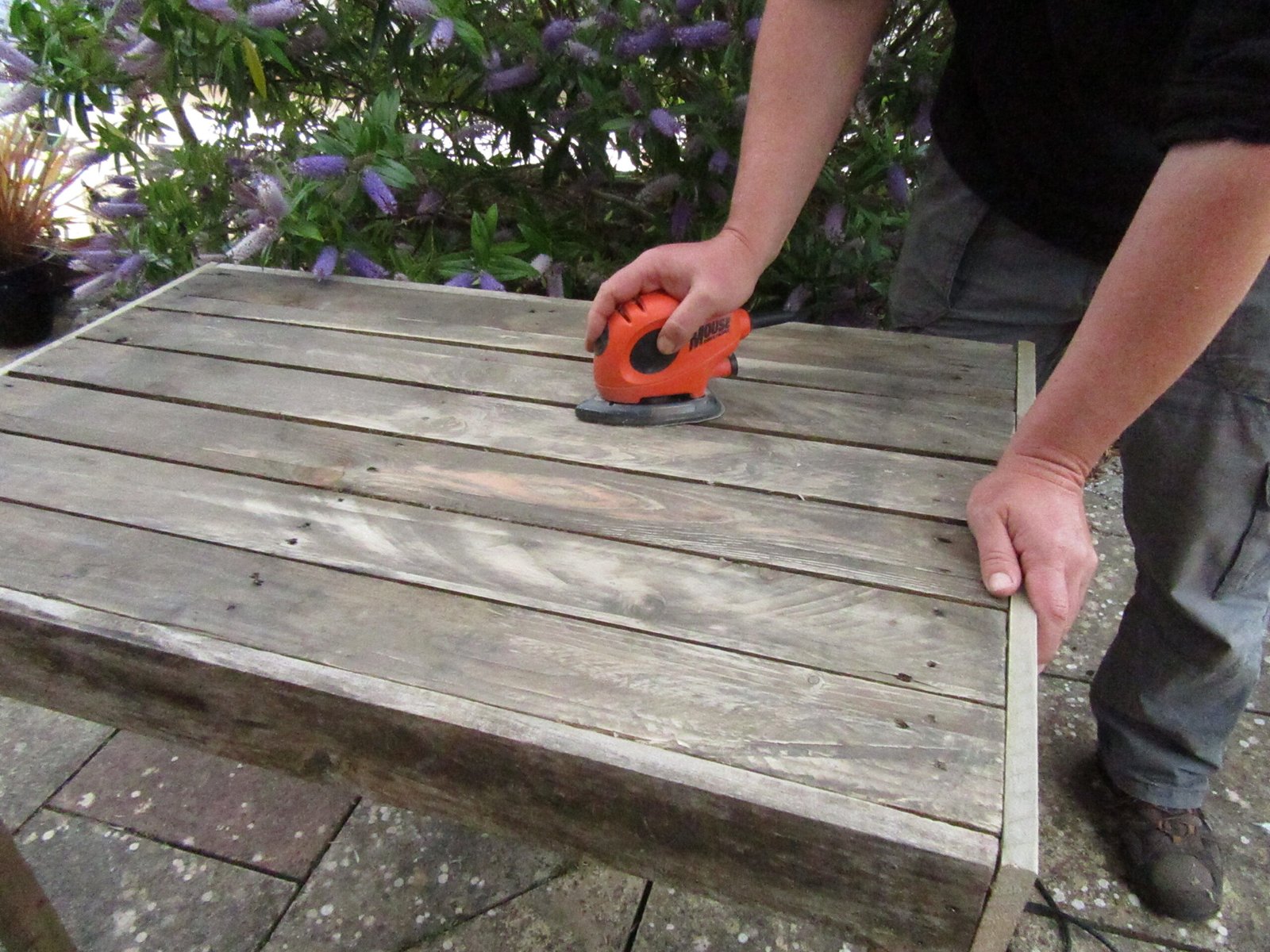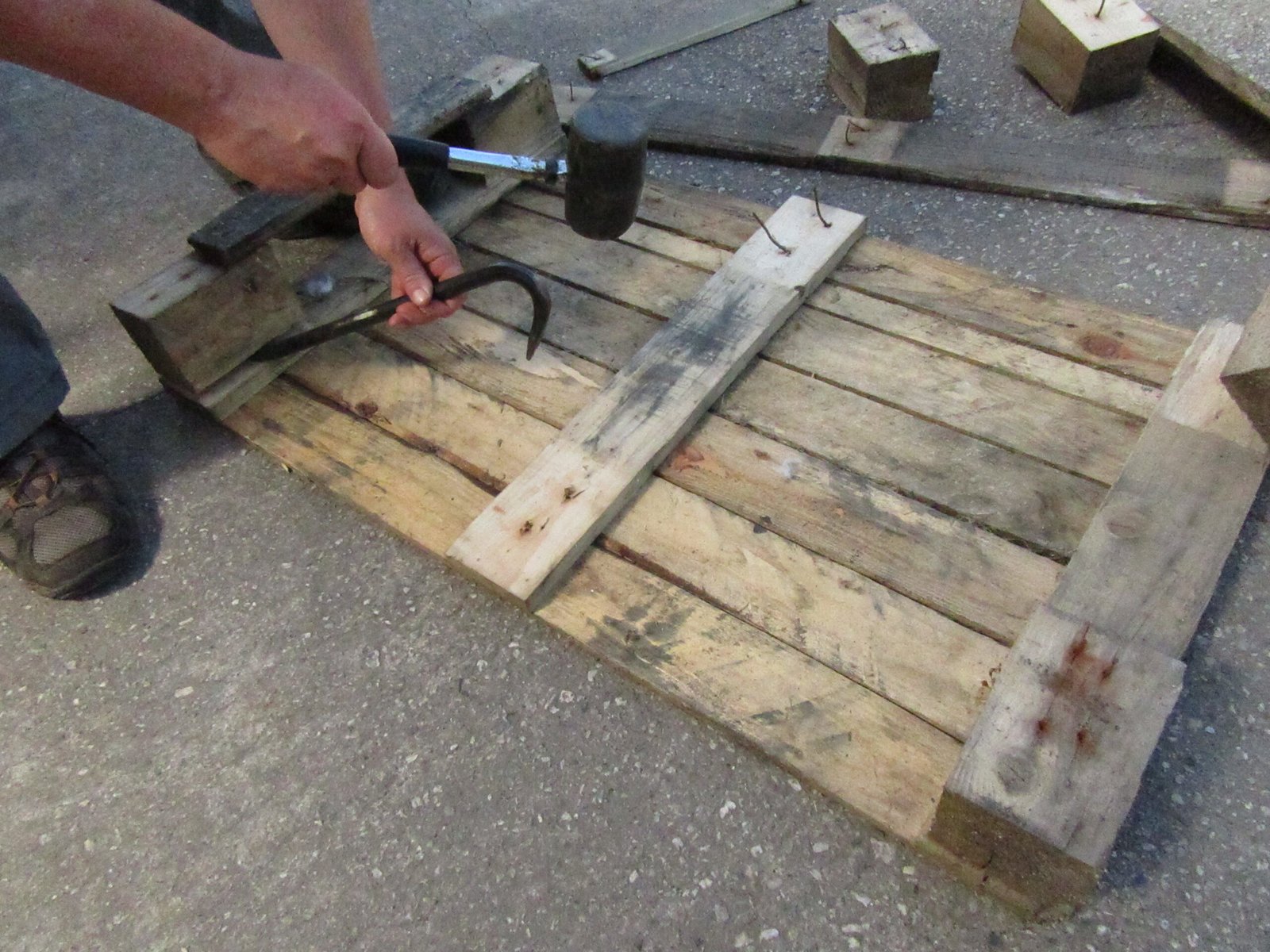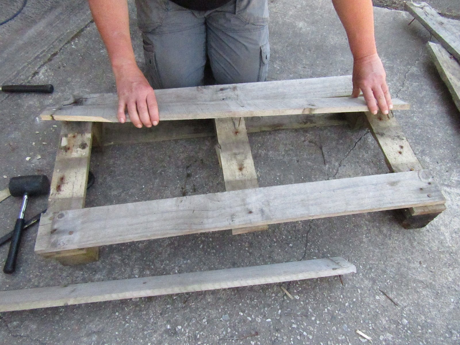 Turn the pallet over and remove the back slats and blocks. This will make the table top lighter and the back slats can be reused for the sides if they’re chunky enough to support the legs.