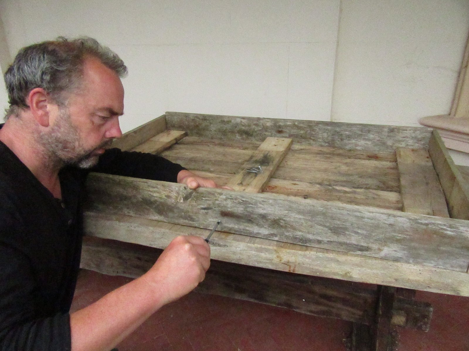Screw the slats to the sides of the table to form the edges of the table top ensuring that the top of the table is level with the top of the edge slates