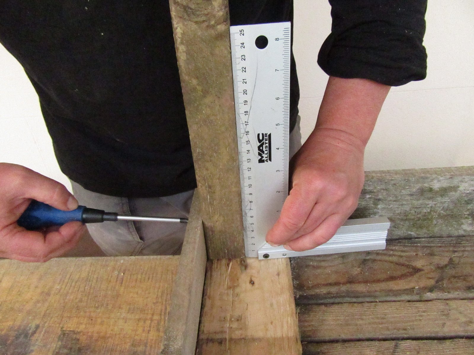 Attach the legs to the inside of the table. Screw them from the outside to fix them to the sides. Check the table is stable and the legs are straight using a carpenters square.