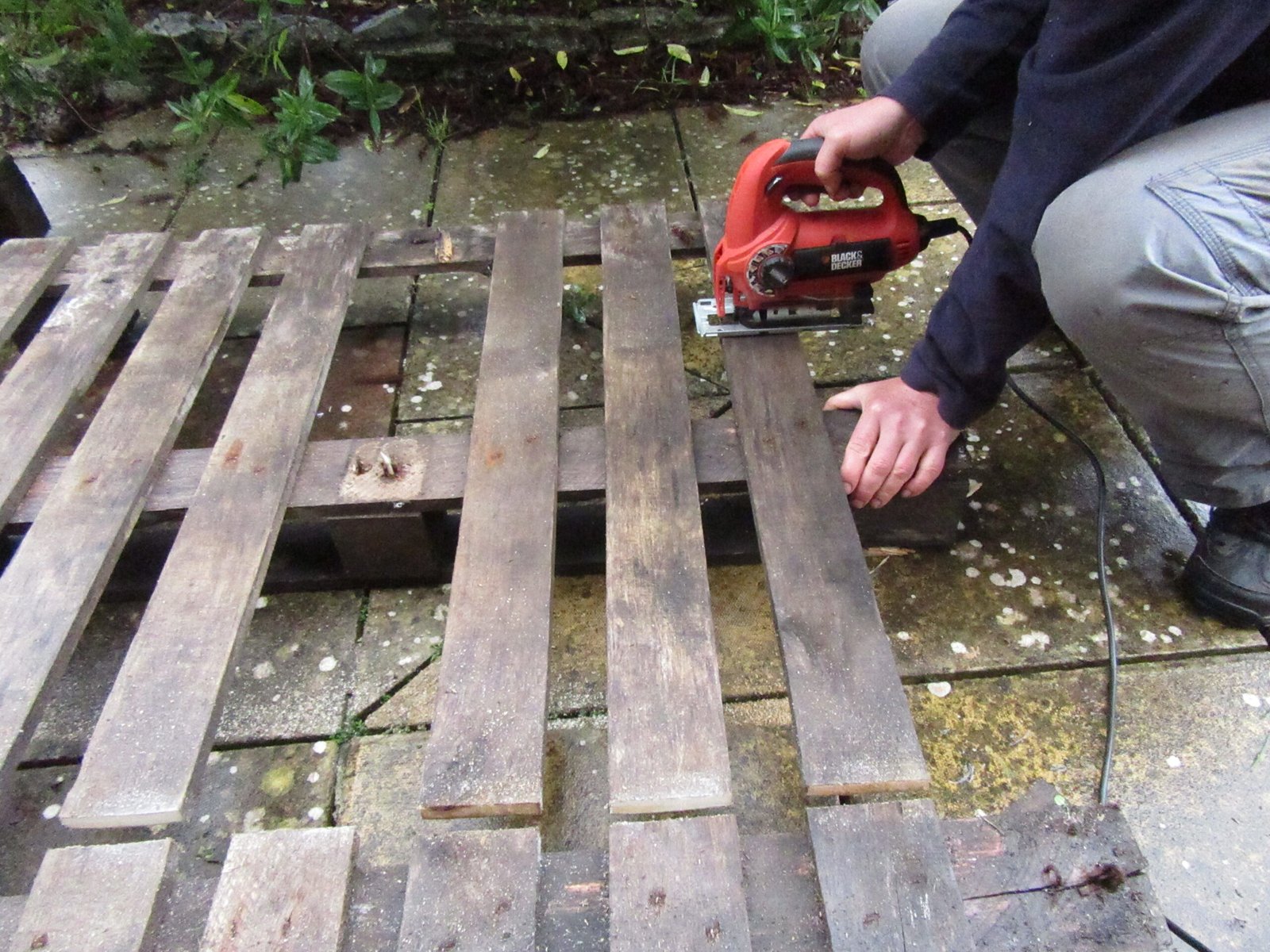 Work out how big your platform needs to be by measuring your container and then use a jigsaw to cut the slats to length at both ends.
