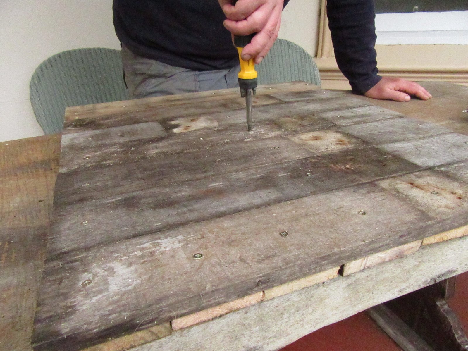 To make a sturdy platform to support a container you will need plenty of pallet slats. Choose a few pallets with the same thickness of slat.