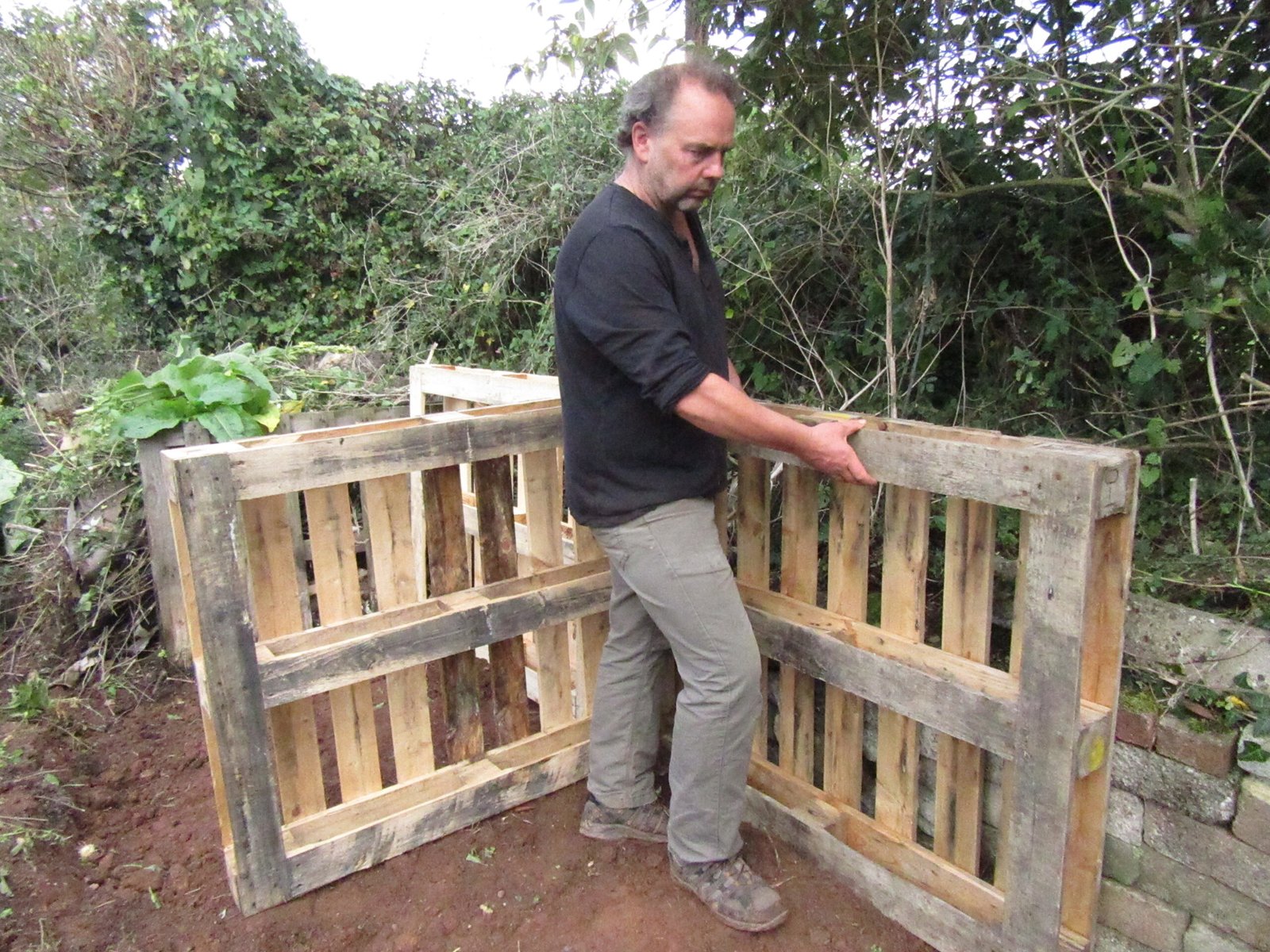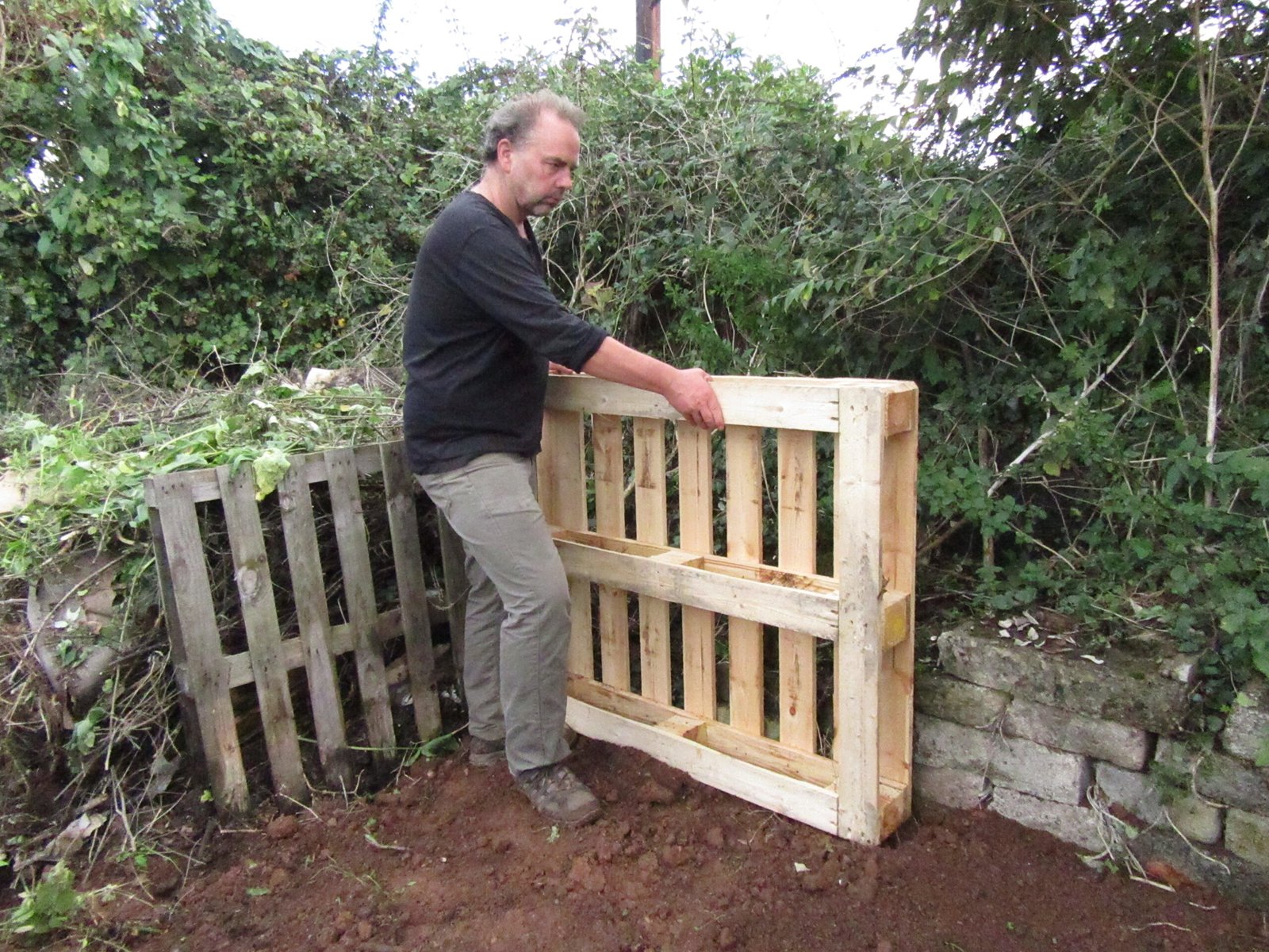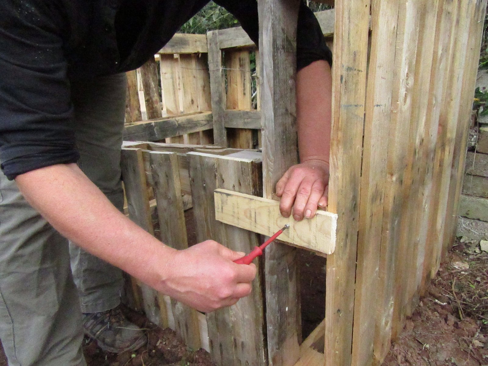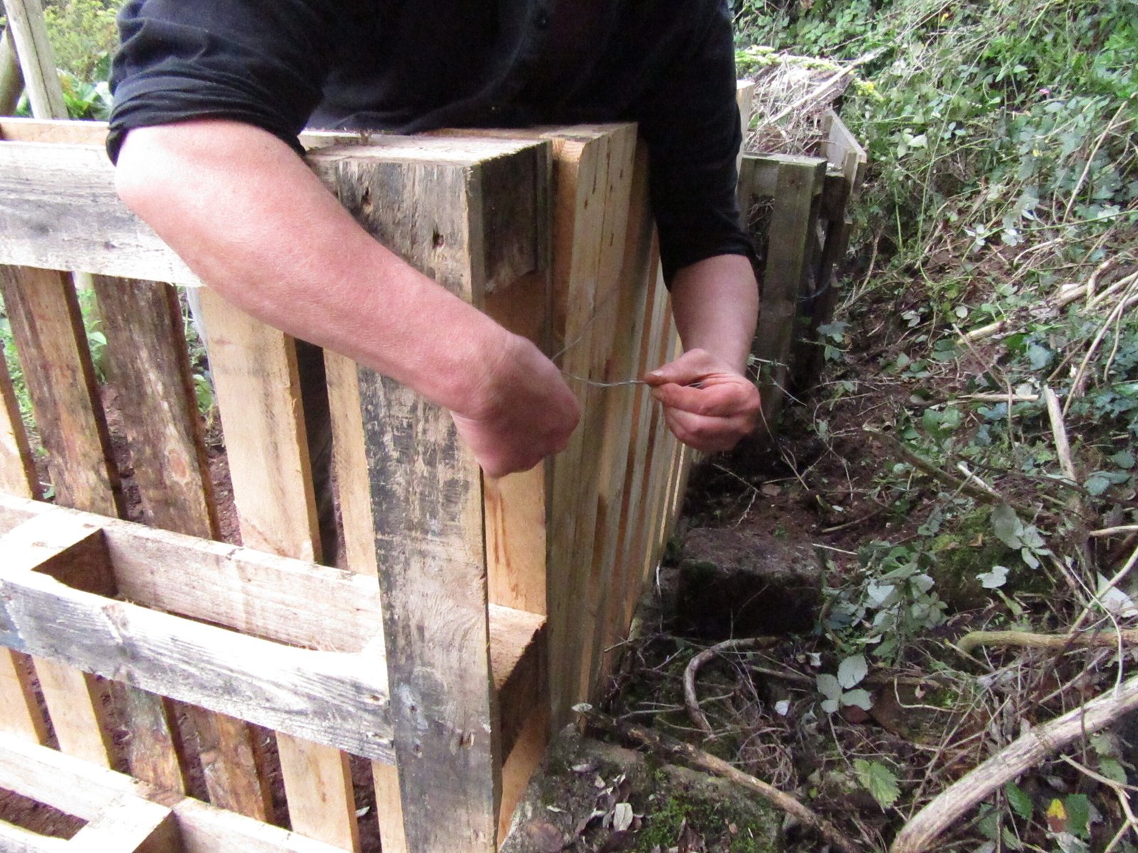 I’ve made compost facilities from pallets many times before. Why I like using pallets is that they are free, and can be knocked up in about an hour requiring very little DIY skills. If possible, try to use pallets that are all the same size. Most standard pallets are 1.20m by 1m. Free pallets can often be found around warehouse facilities, but always ask the owners before helping yourself as some pallets are ‘returnable’ or may well be needed.